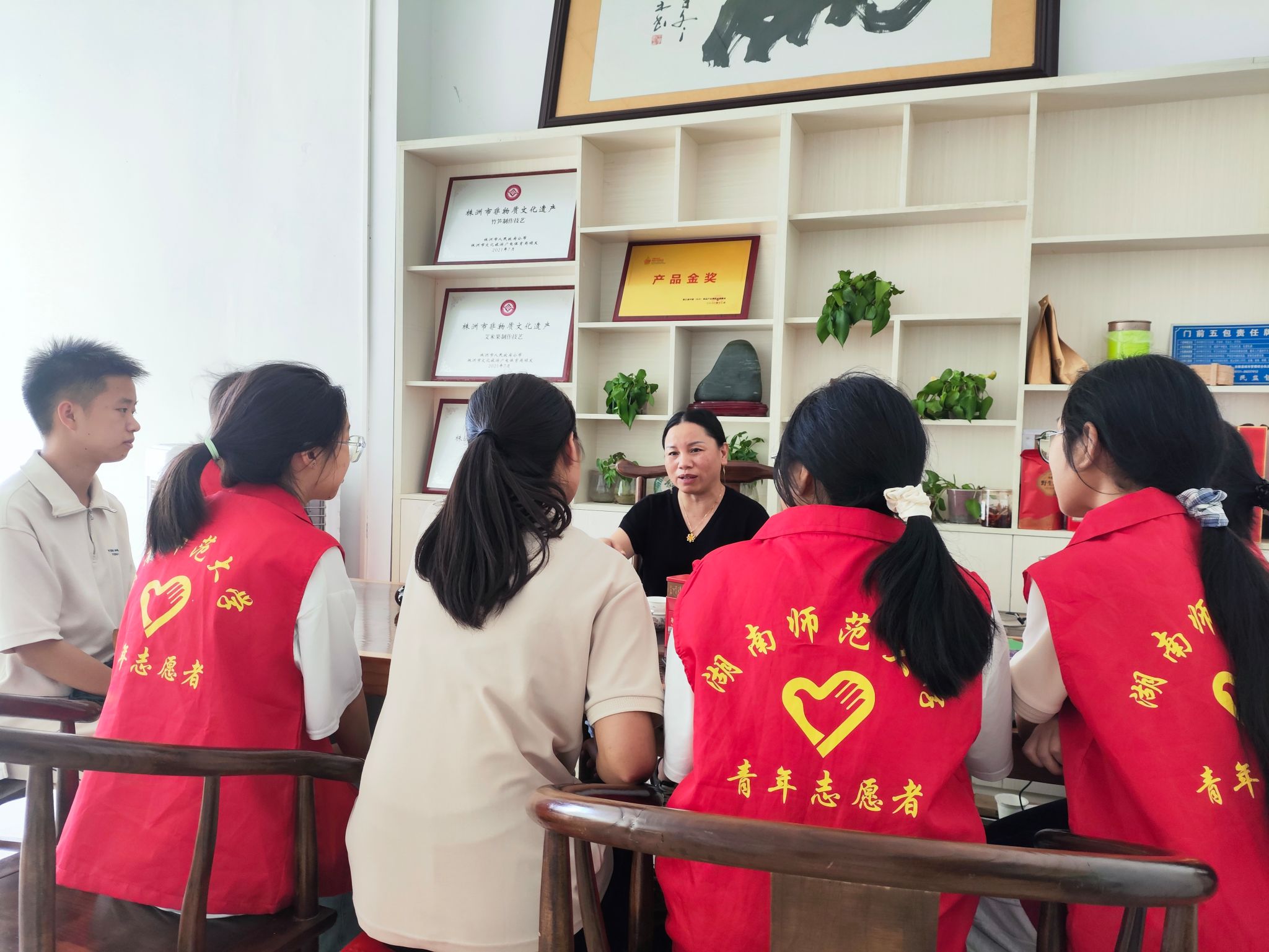实践团成员前往当地米果传承中心采访米果非遗传承人,并向她请教相关背景文化。她为成员们介绍炎陵米果的类型及产业模式等,如米果有艾叶和黄圆两种,且米果的主要销售渠道是直营店。在谈及对米果进行的创新尝试时,传承人表示在制作、保存及运输等方面炎陵米果都有改变,如根据客户的要求进行个性化定制,采用真空包装并进行冷链运输。同时,她邀请实践团成员们品尝正宗米果,并介绍CCTV17拍摄有关炎陵米果的纪录片《谁知盘中餐》,说明炎陵米果在全国已具有一定知名度。