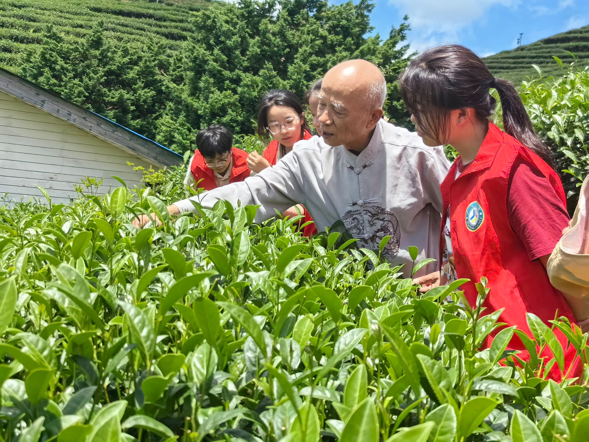 实践团成员前往龟龙窝茶园采访茶园主,并在茶园主带领下参观龟龙窝茶园特色展示区。在茶园主介绍下,成员们了解该茶园占地约1500亩,因山形似龟龙盘卧而得名“龟龙窝”。茶园主表示他是台湾人,因受邀而前来大陆创业。他经多次实地考察后选定龟龙窝进行茶叶种植,并解释所选茶种在种植初期因不适应高海拔的低气温而产量低,但经过品种改良后茶叶产量得到提高。他表示龟龙窝的自然条件和当地传统的手工制茶技艺为茶叶品质提供了重要保障。随后,茶园主为成员们泡制炎陵红茶和绿茶并邀请成员们品尝。成员们与茶园主前往茶田合影留念。