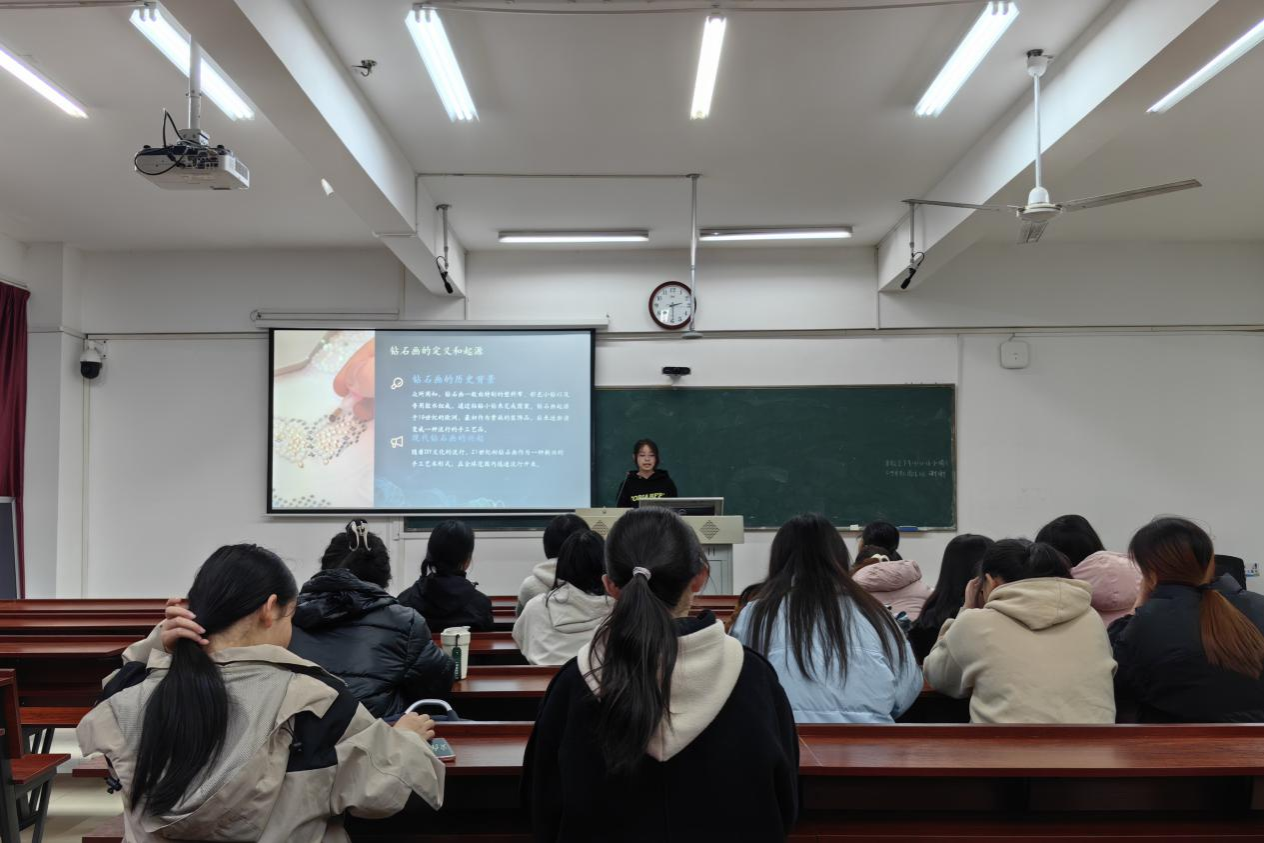 此次活动包括钻石画背景介绍、手工创作和成果展示三个环节。吴慧艳向同学们介绍钻石画的起源、定义及制作方法,她解释钻石画起源于19世纪的欧洲,最初是作为贵族的装饰品,后来逐渐演变成一种流行的手工艺品。钻石画的制作过程包括准备材料、解读画布、粘贴钻石和整理包装四个步骤。同学们在主讲人的带领下,挑选钻石粒,将其粘贴在画布上,并不断调整位置以确保作品的美观和整齐。经过数小时的制作,一幅幅钻石画作品逐一呈现,同学们将作品进行分享展示,并交流钻石画创作的心得和体会。