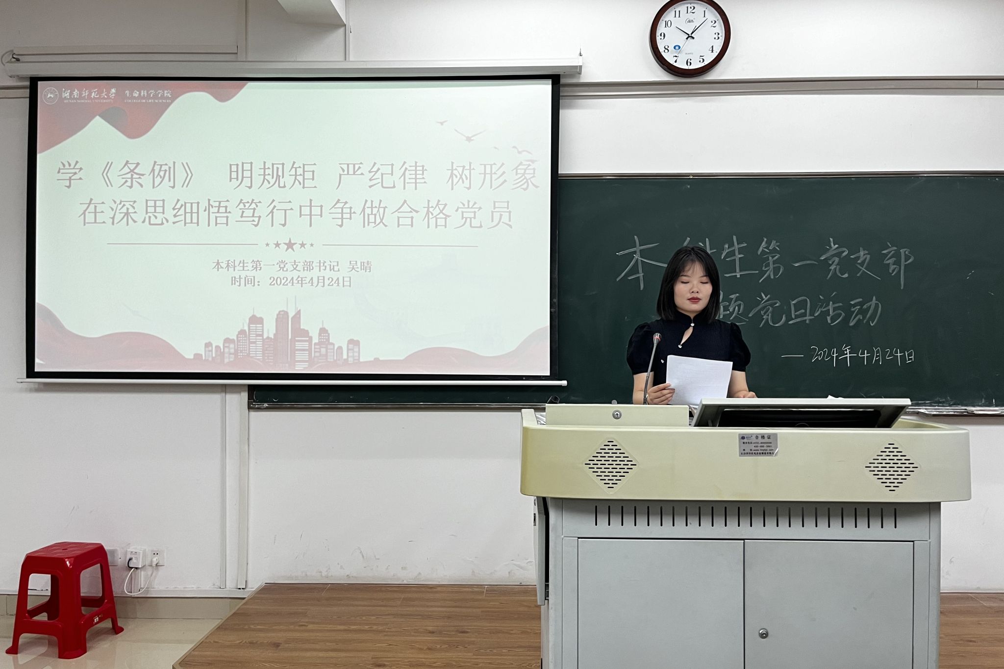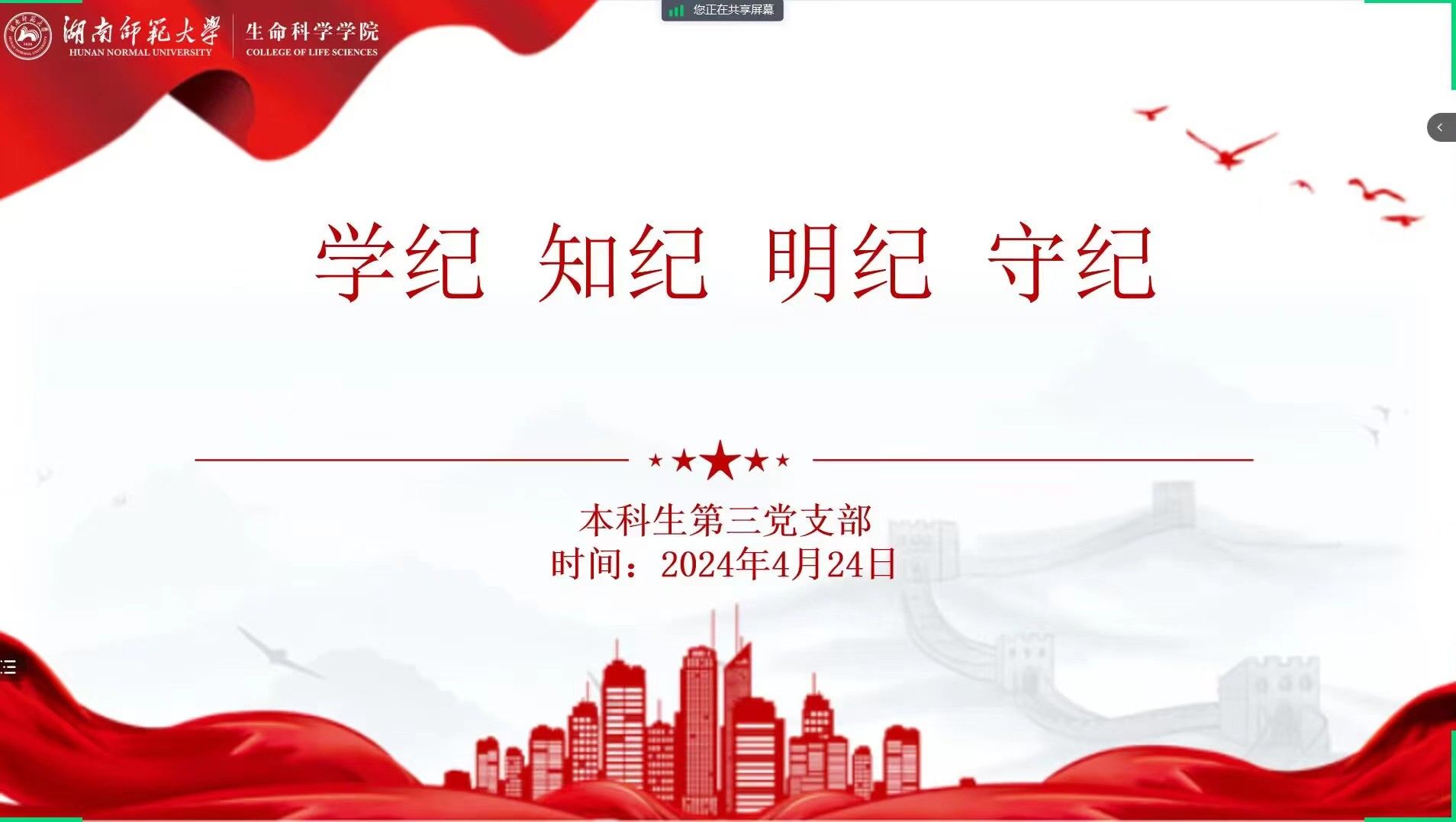 (通讯员 刘智慧 王妍 张晰然)为深入学习贯彻习近平总书记关于党纪学习教育的重要讲话和重要指示精神,进一步促进全体党员学懂弄通《中国共产党纪律处分条例》(以下简称《条例》),生命科学学院本科生党支部于2024年4月24日开展以“学《条例》 明规矩 严纪律 树形象 在深思细悟笃行中争做合格党员”为主题的党纪学习活动。本科生党支部书记吴晴、周冲、罗静伟参加党纪学习活动,党支部组织委员谌鑫怡、何敏、刘智慧主持会议。