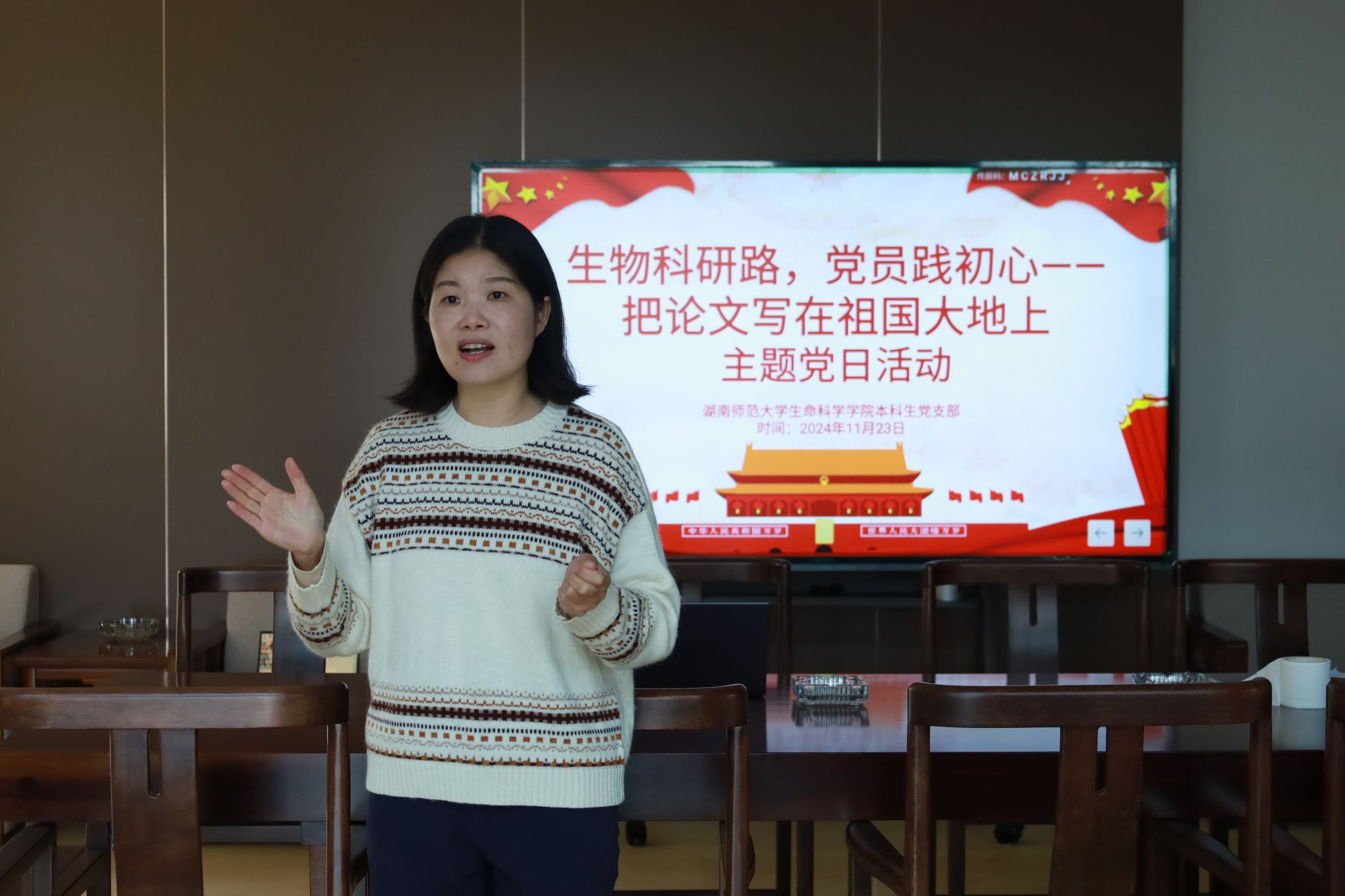 活动第四项:专题研讨。党员同志们围绕“作为学生党员,如何将生物科研成果更好地服务于国家重大需求,把论文写在祖国大地上?”开展研讨学习活动。在经过交流与讨论后,邱靖雯同志作为代表进行发言。她以学生党员的视角,深入阐述了如何将生物科研成果更有效地服务于国家的重大需求。她强调了专注于国家关键领域的研究,积极参与基层实践和科普活动,以及积极申报并参与生物领域的国家级项目的重要性。她还提到了通过举办讲座和撰写文章来普及生物科研成果,学以致用,用青春为中国式现代化挺膺担当。
