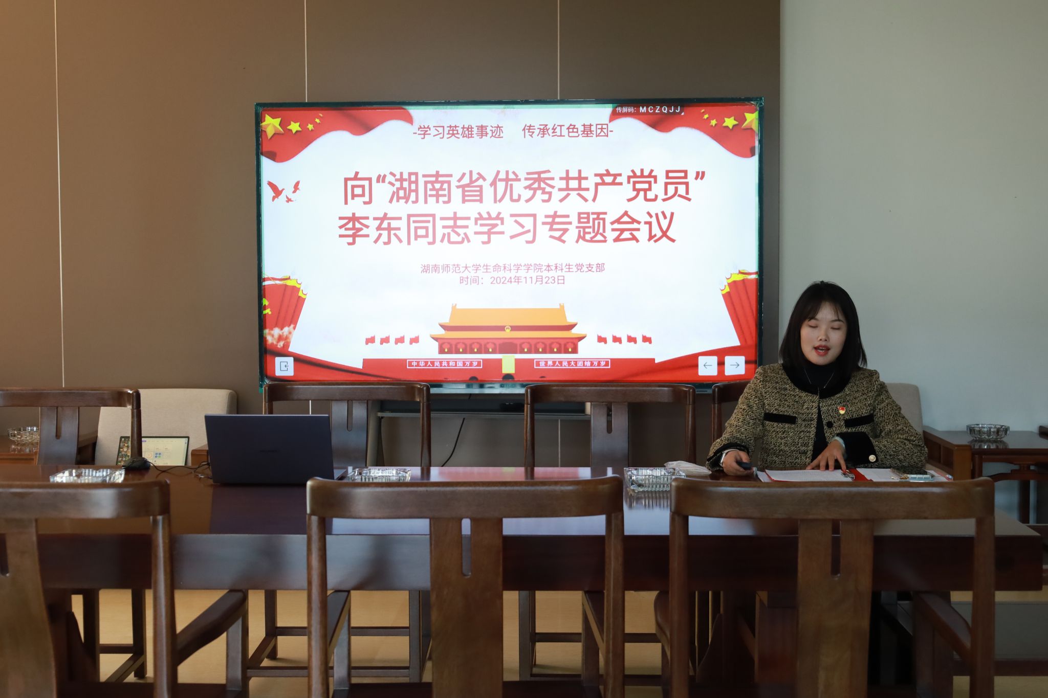 (通讯员 王妍 黄辰希 邓芝涵)为全面贯彻落实习近平新时代中国特色社会主义思想,学习英雄事迹,传承红色基因,2024年11月23日上午,生命科学学院本科生党支部于国家淡水鱼实验基地(望城)开展“向湖南省优秀共产党员李东同志学习”的专题学习会议。生科院党委副书记彭赛丰、本科生第三党支部书记罗静伟出席此次活动。会议由本科生第一党支部书记吴晴主持并领学,本科生党员积极参与,共同缅怀英雄事迹,汲取精神力量。