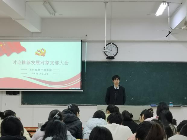 会议按以下四项议程展开:一、入党积极分子刘新时等62位同志按班级推选、学院系统推选及党员推荐次序轮流阐述自己对党的认识、入党动机等相关情况;二、党员培养联系人发言以及正式党员就入党相关问题向刘新时等62位同志进行提问;三、与会党员对62名同志的表现、日常学习生活中的行为作风等,各抒己见,提出了许多建设性的意见和建议;四、无记名投票表决。根据本人申请、组织培养,经支部大会讨论,支部委员会研究,学院党委同意,确定刘新时等20名同志为党员发展对象。各发展对象表示,未来将不忘初心,持续深入学习党的理论知识,在日常生活与实践中以身作则,充分发挥学生党员的先锋模范作用。