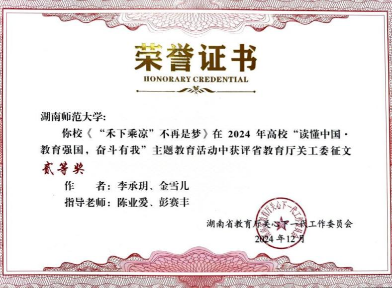 在征文类评选中,李承玥与金雪儿合作的《“禾下乘凉”不再是梦》荣获湖南省教育厅关工委“征文贰等奖”,指导教师陈业爱、彭赛丰凭借扎实的专业素养,为学生创作提供有力支持。
