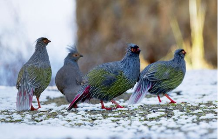 3、声音:呼唤叫声通常听到的有3音节“ju-juju”及4音节“ju-jujuju”两种,为同种个体间进行联系的叫声。报警叫声声似“jiuwei”很尖厉,为个体受惊或发现危险时发出,具有报警作用。联络叫声由两音节“jiou-wei”组成,有颤音成分,为血雉群体活动时个体间互相保持联系的一种叫声,似有暗示同伴平安无事之意。