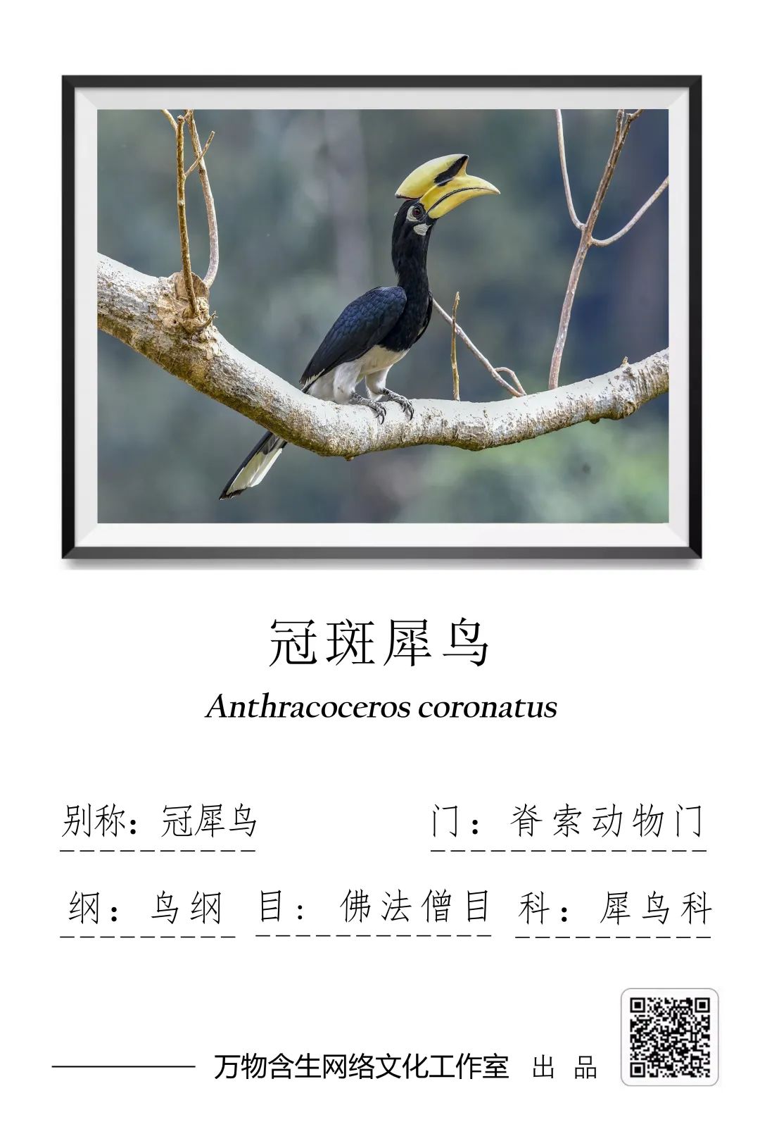 冠斑犀鸟是佛法僧目犀鸟科的鸟类,属大型攀禽,又称冠犀鸟。列入《国家重点保护野生动物名录》:国家二级保护动物(1988年12月10日生效)。(注:犀鸟科,所有种)列入《世界自然保护联盟濒危物种红色名录》(The IUCN Red List):近危物种(NT),2012年评估。列入《中国国家重点保护野生动物名录》,2020年6月囯家林业局定为一级保护动物。