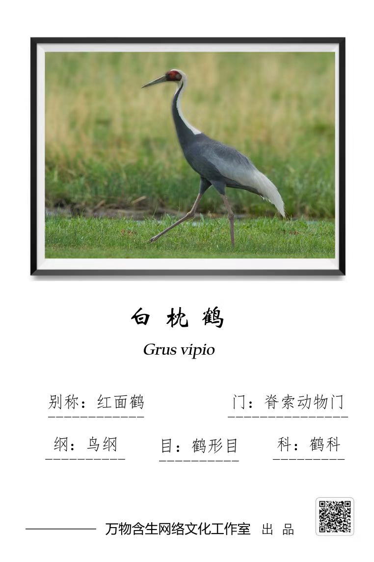 白枕鹤(Grus vipio)为鹤形目鹤科鹤属的鸟类,又称为红面鹤,是国家Ⅰ级重点保护野生动物,被IUCN列为易危(VU)物种。