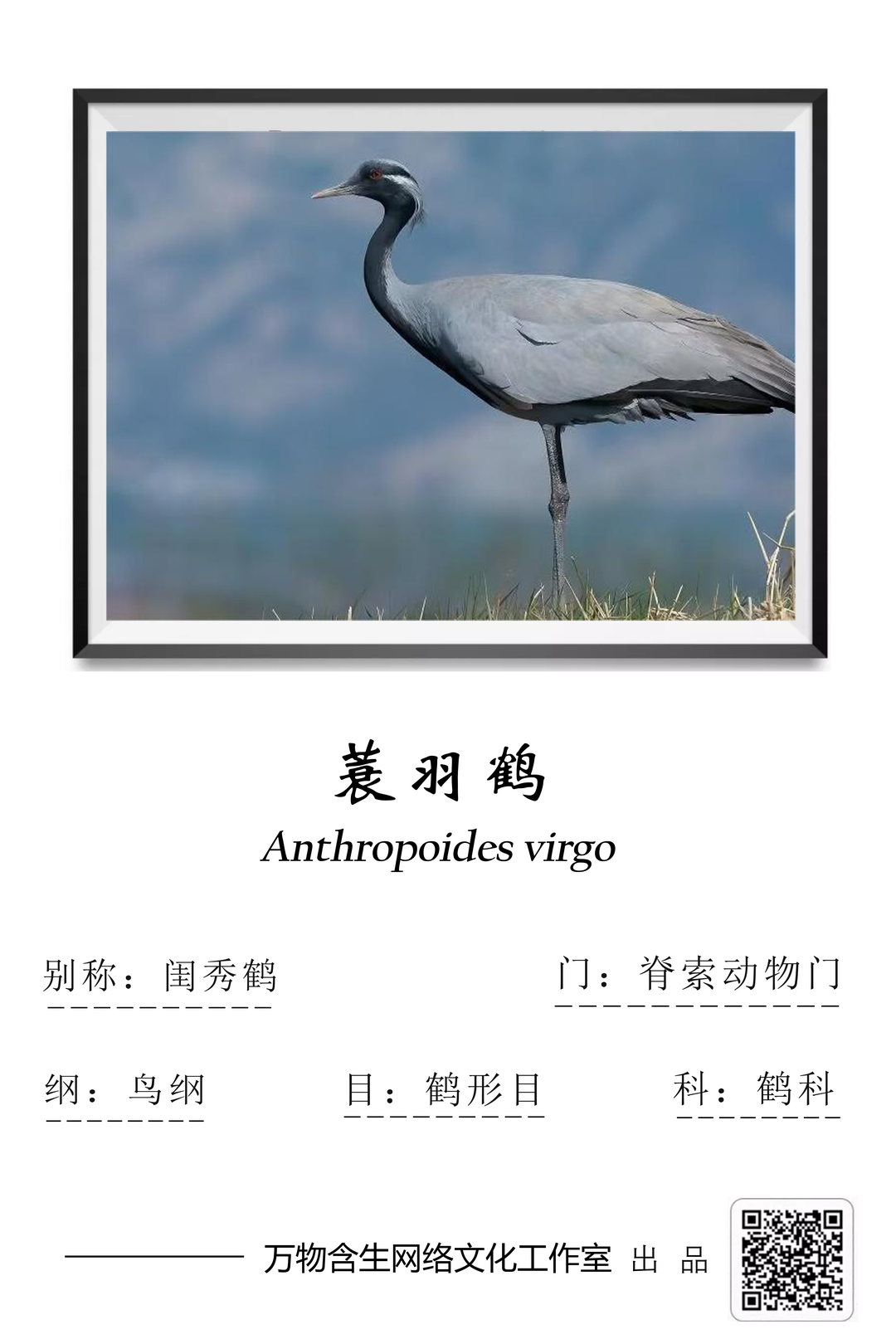 蓑羽鹤(Anthropoides virgo)是鹤形目鹤科蓑羽鹤属动物,属于大型涉禽。其别名是闺秀鹤,被列入《世界自然保护联盟濒危物种红色名录》(IUCN)——无危(LC)和我国《国家重点保护野生动物名录》二级。
