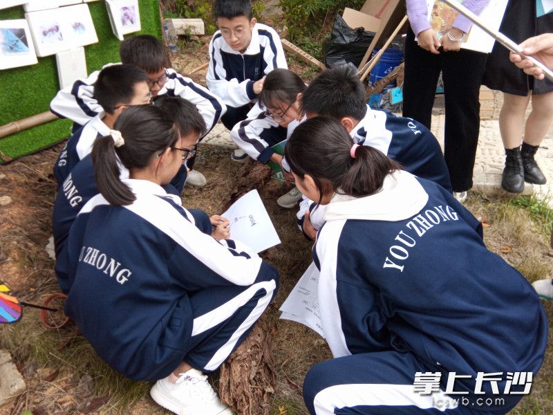 李星是湖南师范大学友仁中学实习队队长,也是本次校地联合自然科普公开课的主讲老师。这是一种全新的授课模式,湖南师范大学生科院与友仁中学携手,突破传统教学时空间的束缚,将生物教学与自然科普有效结合。以上环节只是八年级上册第三章“动物在生物圈中的作用”课四个环节中的一个——户外翻转课堂,学生通过三个场景的轮换,根据讲解人的提示完成学案任务,有一种剧本杀的味道。后续环节是根据老师提供的线索分组探究,让学生在自然中发现学习,通过小组讨论,分享成果,最后回到户内教室,揭晓答案,深化主题。